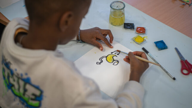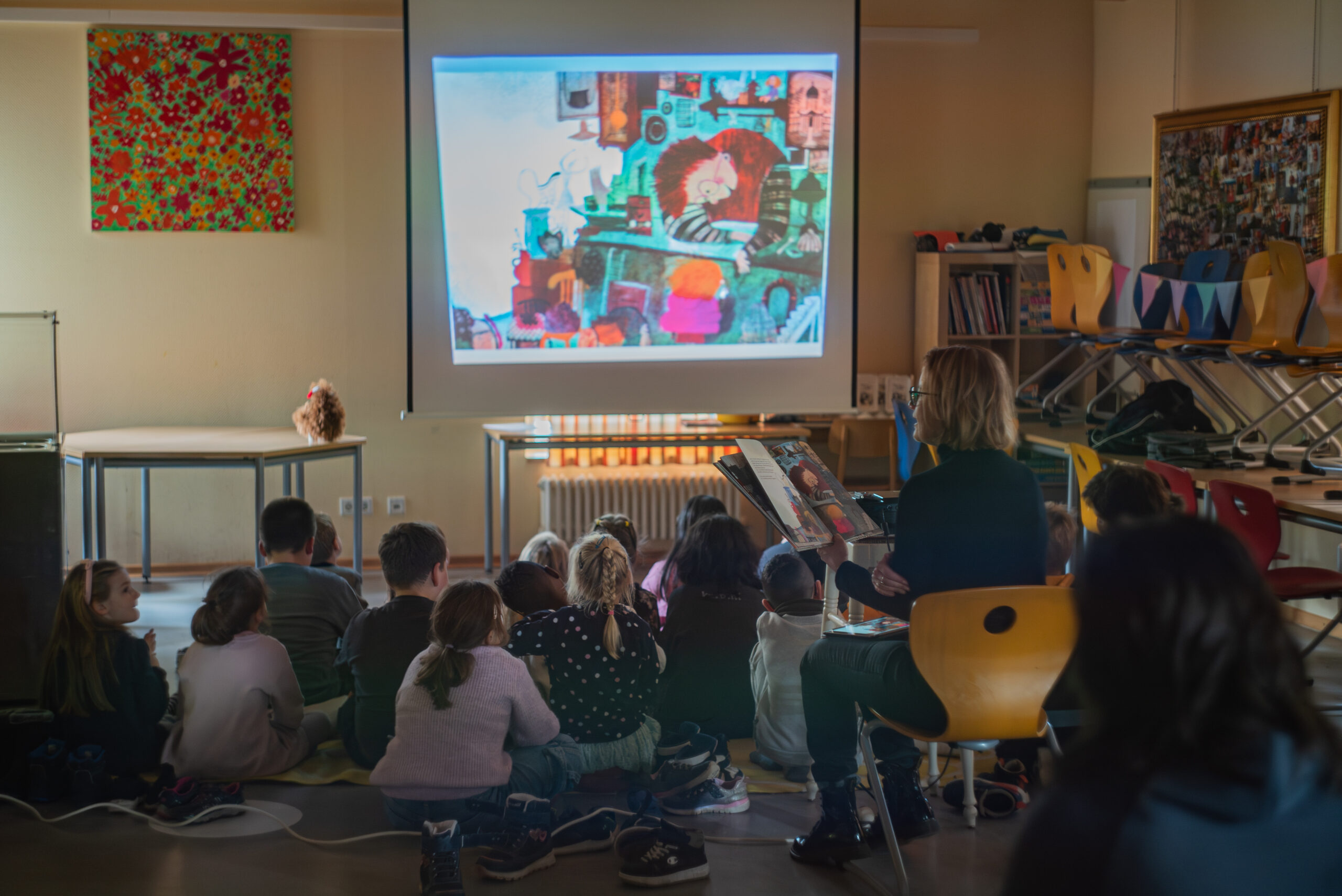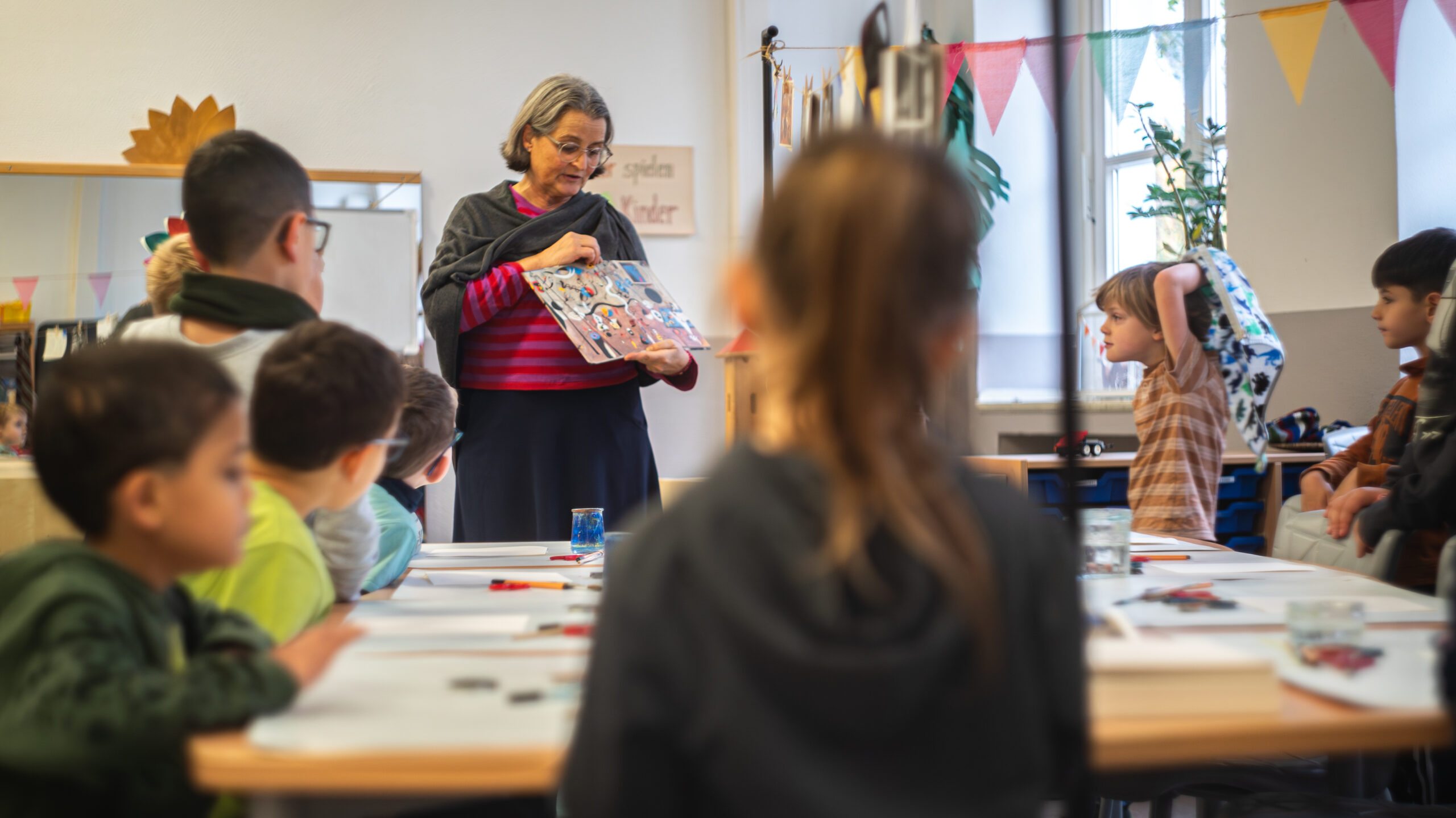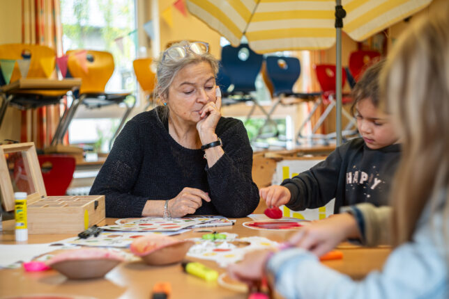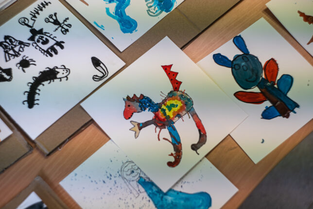 Schon beim Betreten der Räume war die Neugier groß. An verschiedenen Stationen wurde vorgelesen, gemalt, erzählt, gespielt und frei erfunden – alles mit dem Ziel, Kinder auf spielerische Weise für Geschichten zu begeistern. An der Kunststation von jugendstil-Referentin Susanne Klinkhamels entstanden farbenfrohe Fantasietiere, inspiriert von Joan Miró. Aus den Bildern entwickelten die Kinder eigene Geschichten und lernten so, wie eng Kreativität, Sprache und Fantasie miteinander verbunden sind.